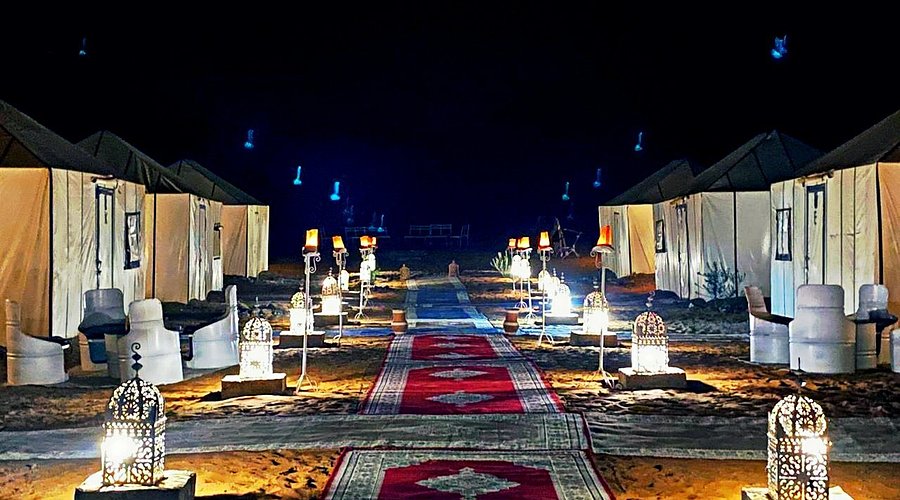 Exclusivo campamento de lujo ubicado en las impresionantes dunas de Erg Chebbi, en Merzouga. Ofrece lujosas tiendas nómadas privadas con baño, agua caliente, Wi-Fi gratuito y desayuno halal al aire libre. Los servicios incluyen vistas al jardín, bar, terraza y zonas comunes pensadas para disfrutar al máximo del entorno.