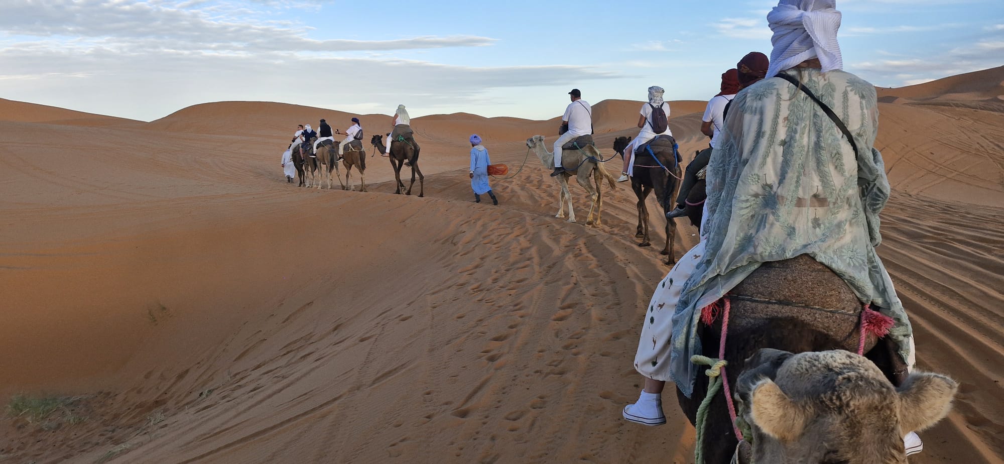 Excursión en camello (o 4×4 para quienes prefieran) de 40 minutos para admirar el atardecer, realizar sandboarding y continuar hasta el campamento bereber. Cena tradicional y velada con música bereber bajo un espectacular cielo estrellado.